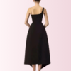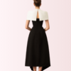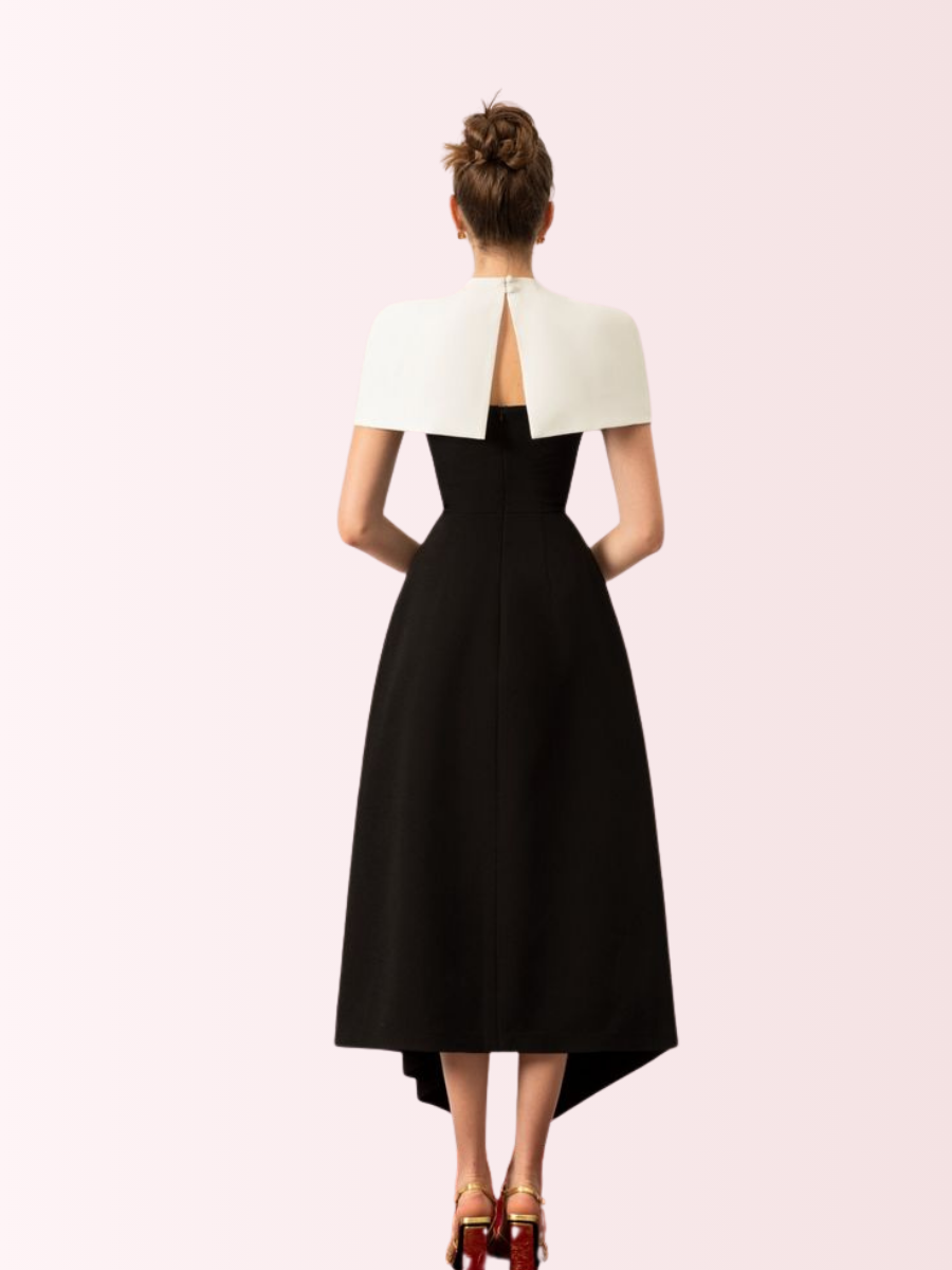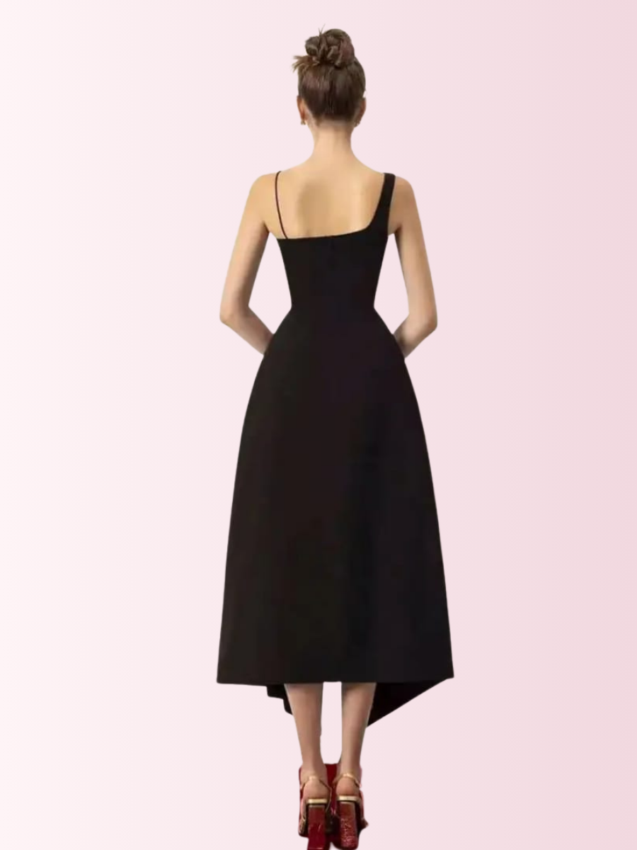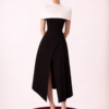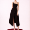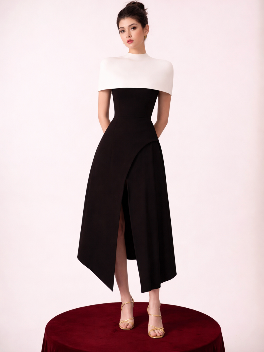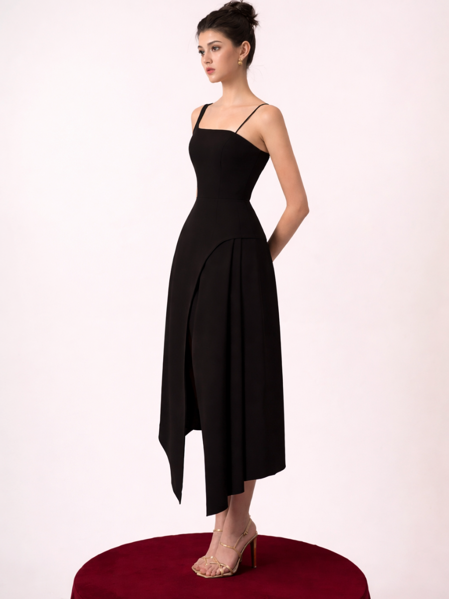 Tailored where it matters. Fluid where it counts. A sculpted bodice with a flowing, asymmetric fall.