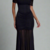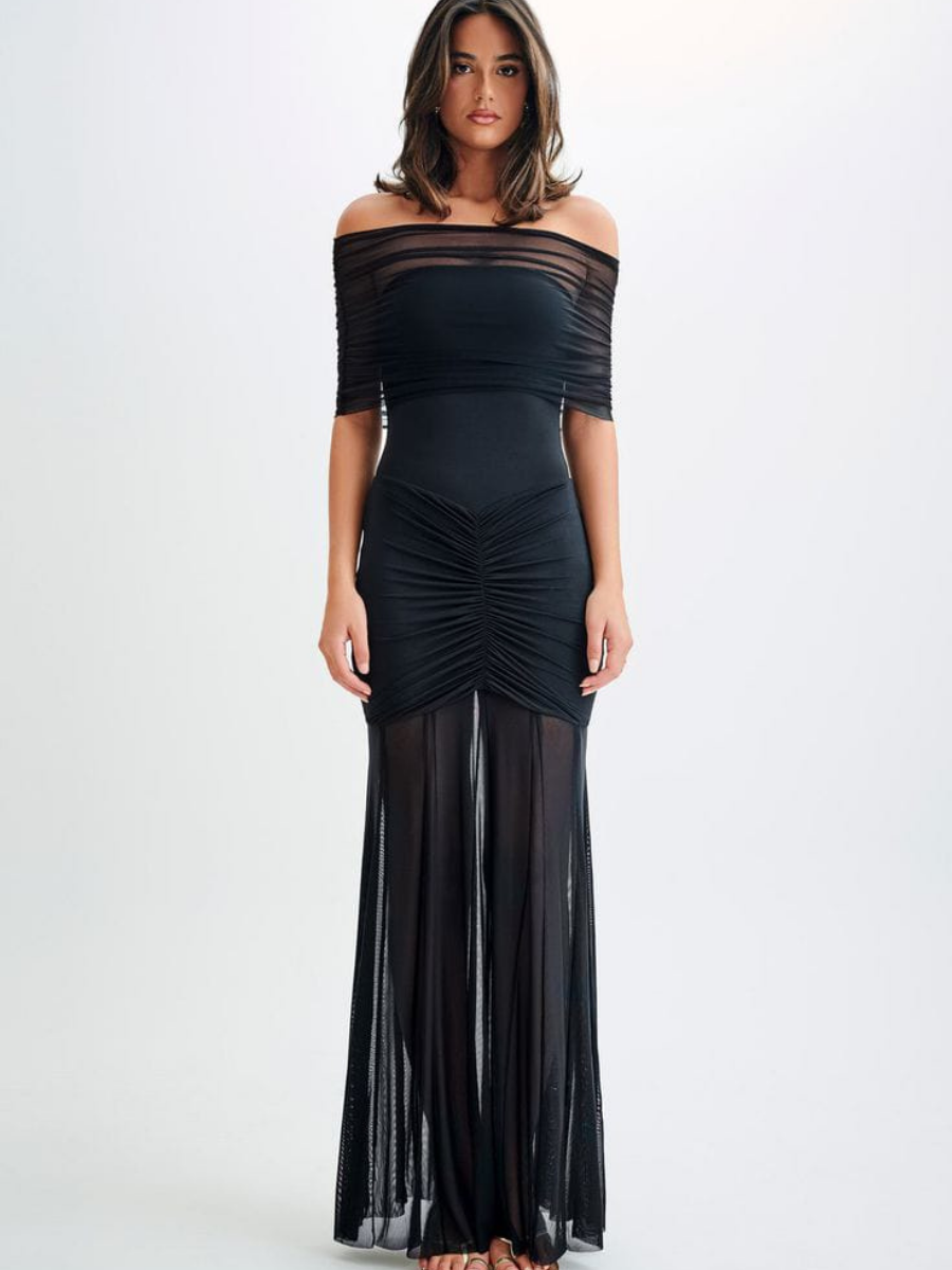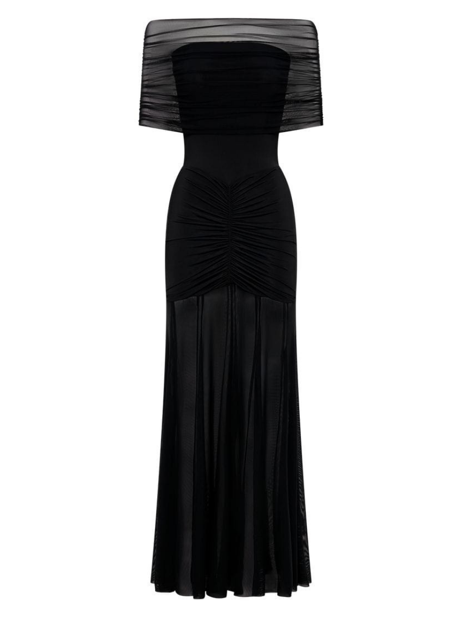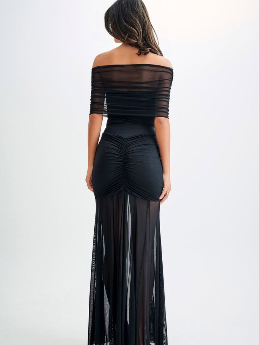 A sleek silhouette that hugs the body through the waist and hips, finished with a sheer, fluid fall. Balanced, sharp, and refined.
