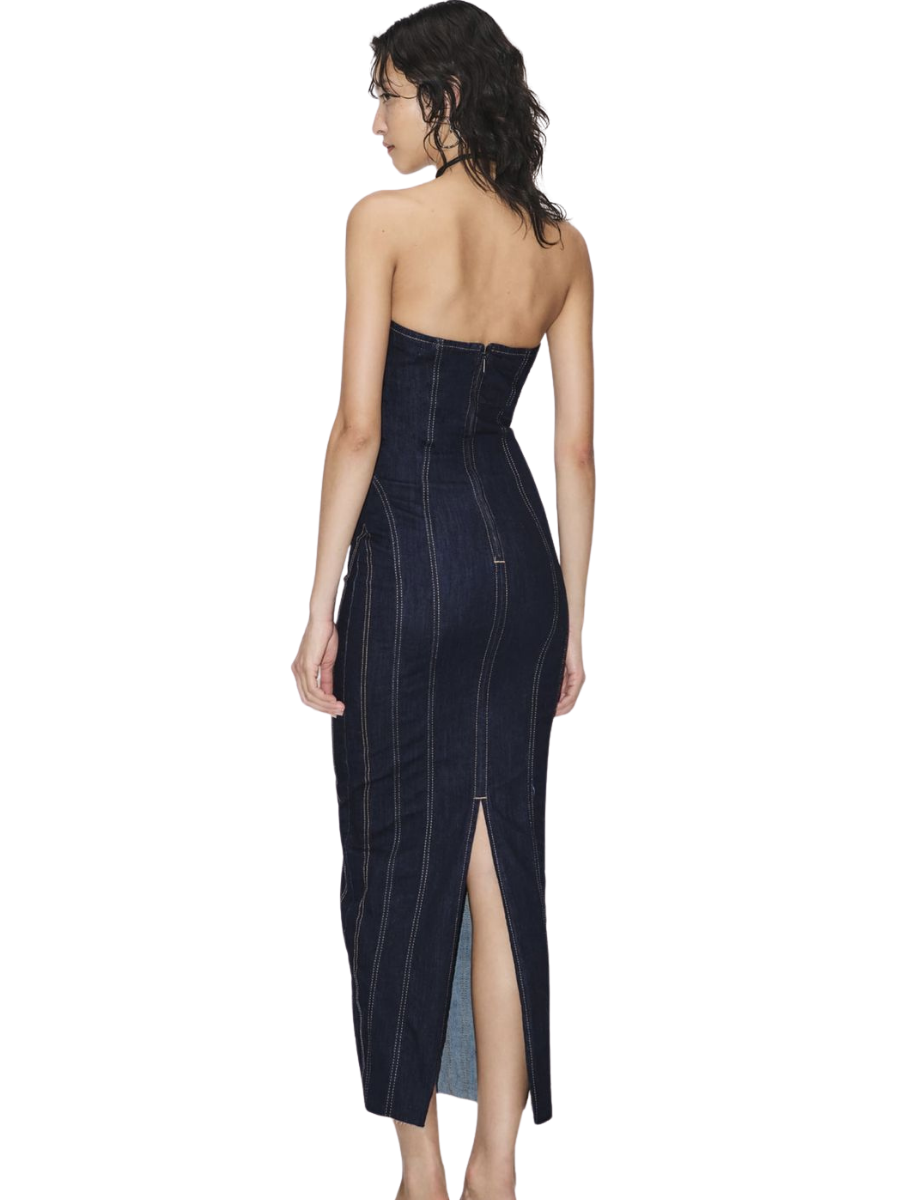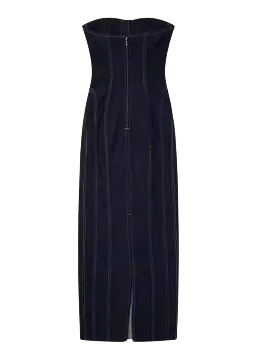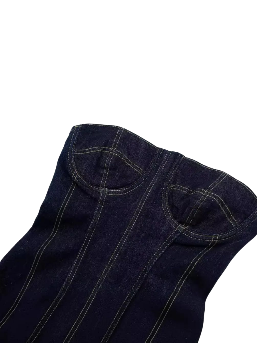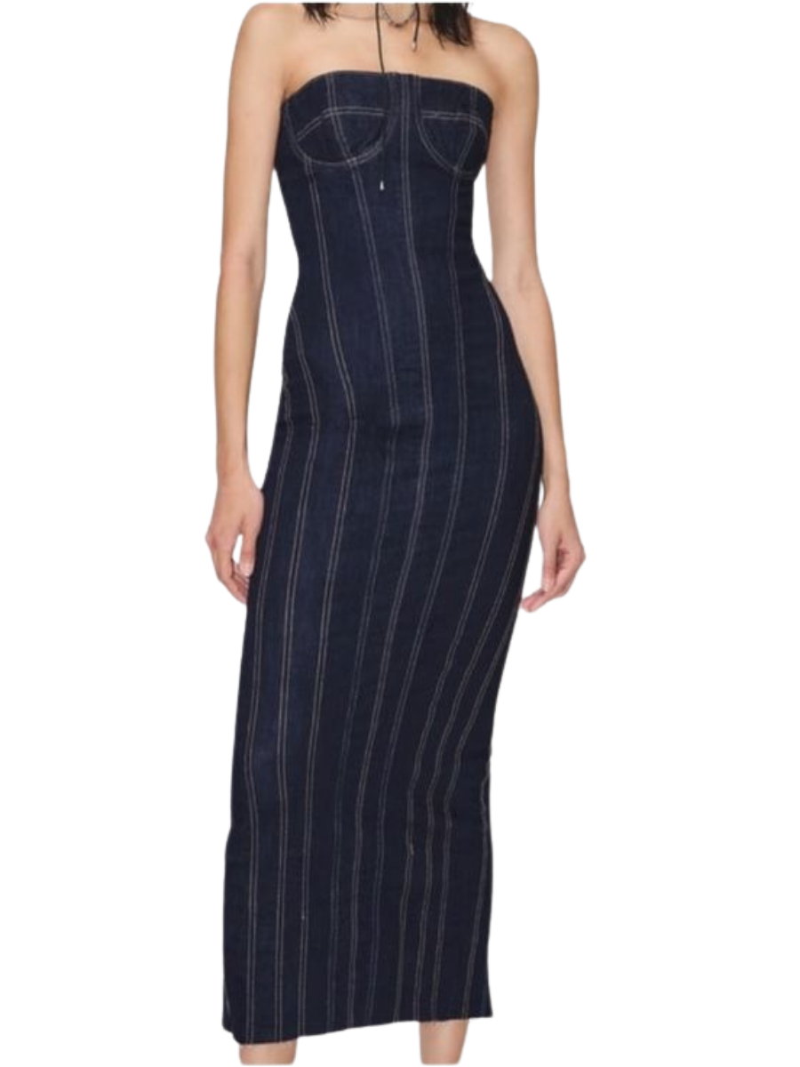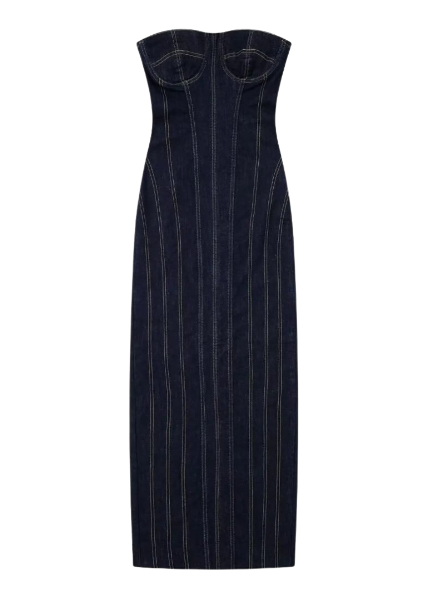 This strapless denim corset dress hugs in all the right places, with vertical panel detailing that elongates your frame. The dark indigo wash keeps it sharp and elevated, while the body-contouring fit does all the heavy lifting.