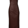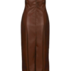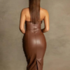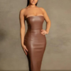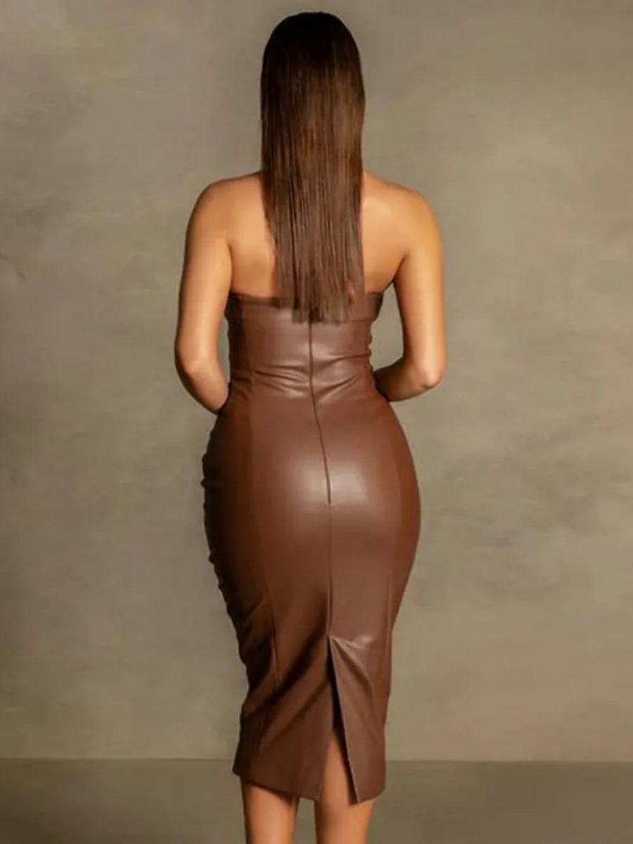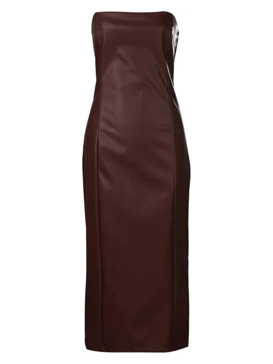 This strapless faux leather dress is all about a clean, body-hugging fit with a smooth, second-skin feel. The rich chocolate tone adds depth, while the structured corset shape keeps everything sharp and defined.