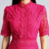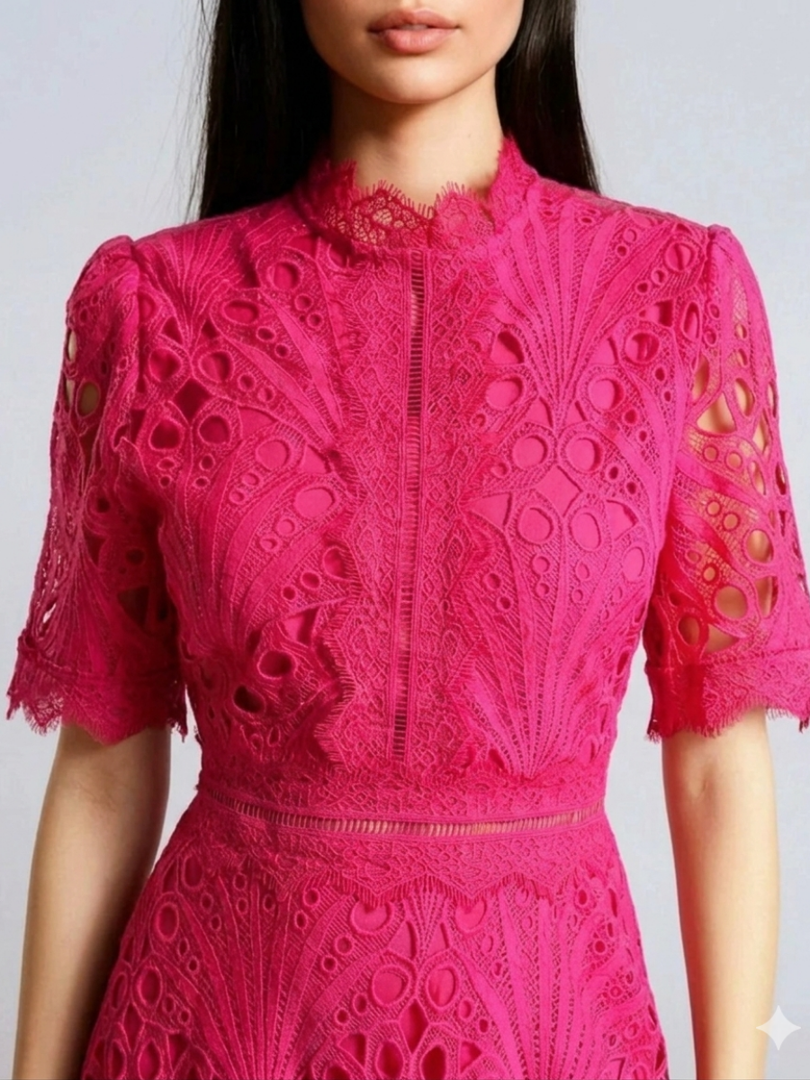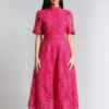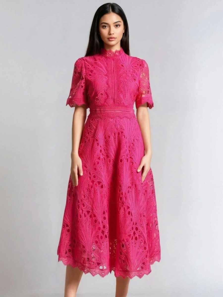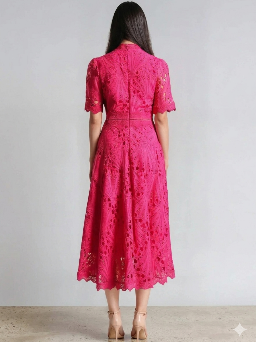 This midi dress comes with a structured bodice, high neckline, and flowy skirt create a flattering, feminine silhouette, while the intricate cutwork adds just the right amount of detail.