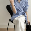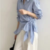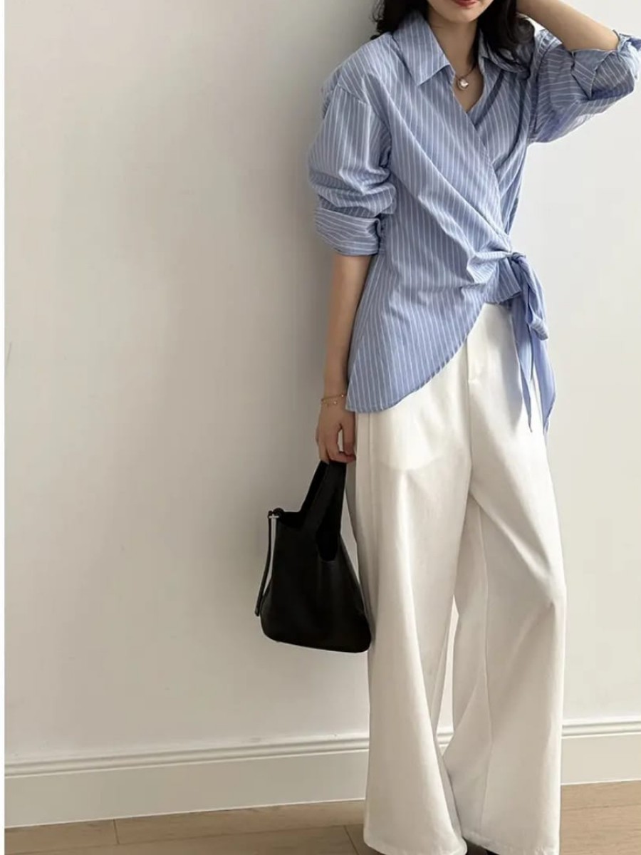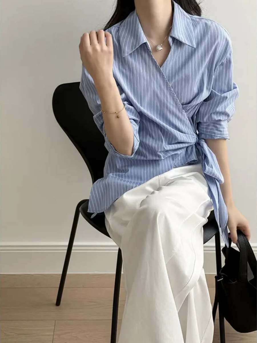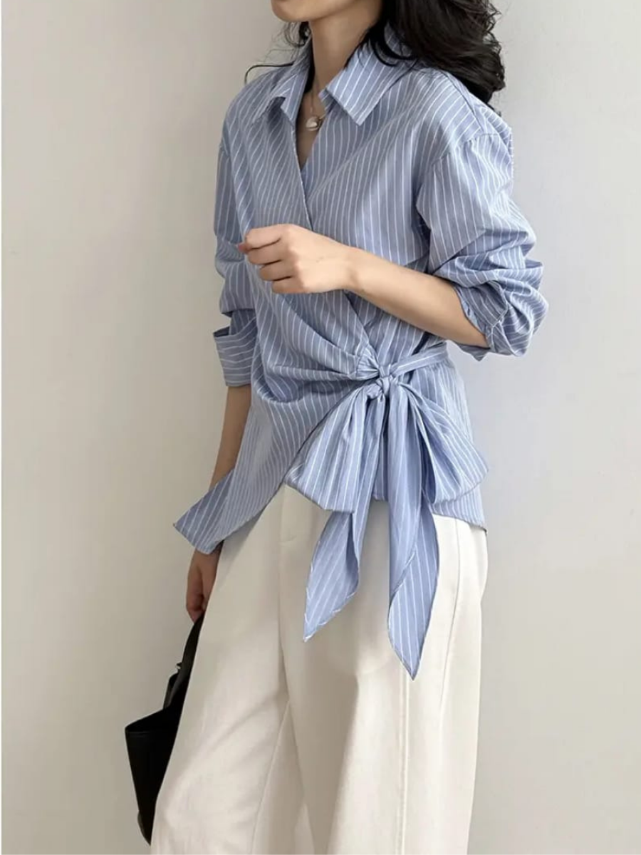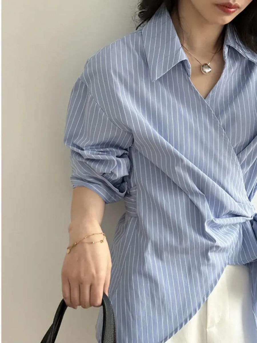 A relaxed-fit shirt with a wrap-style front and side tie that lets you adjust the fit as you like. The relaxed cut and clean stripe pattern make it easy to dress up or down.