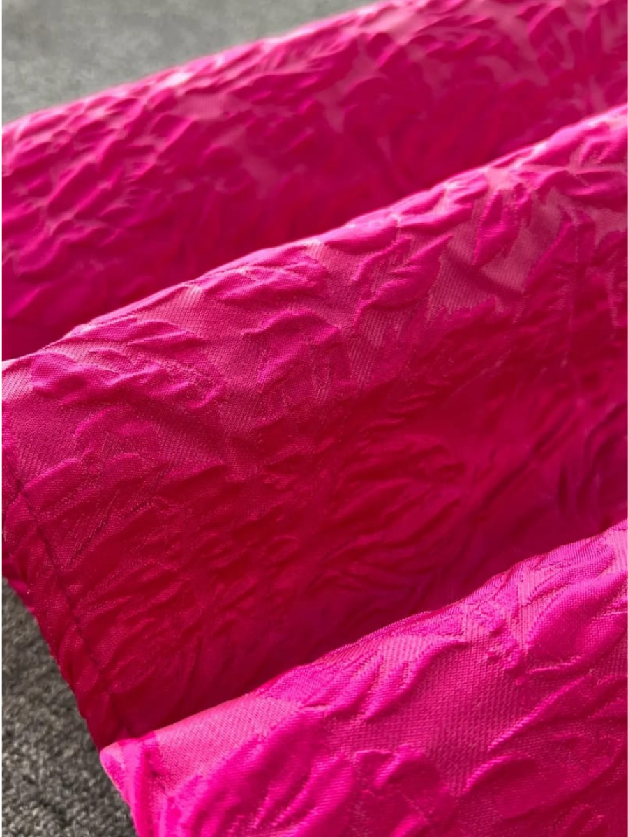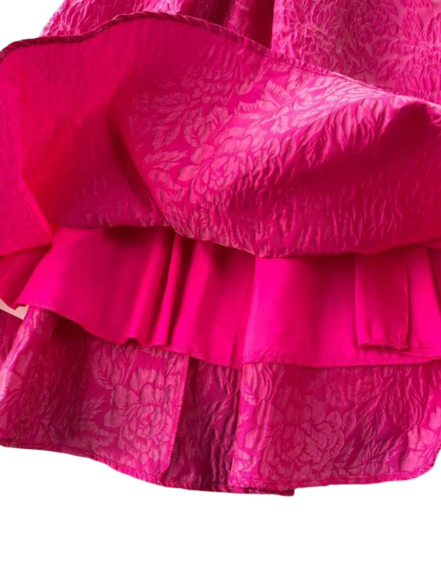 A luxe textured finish in a bold pink that instantly lifts the mood. Fitted at the top, flowing into a full, easy skirt.
