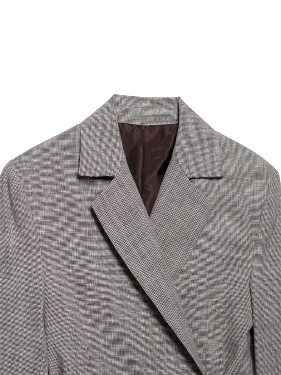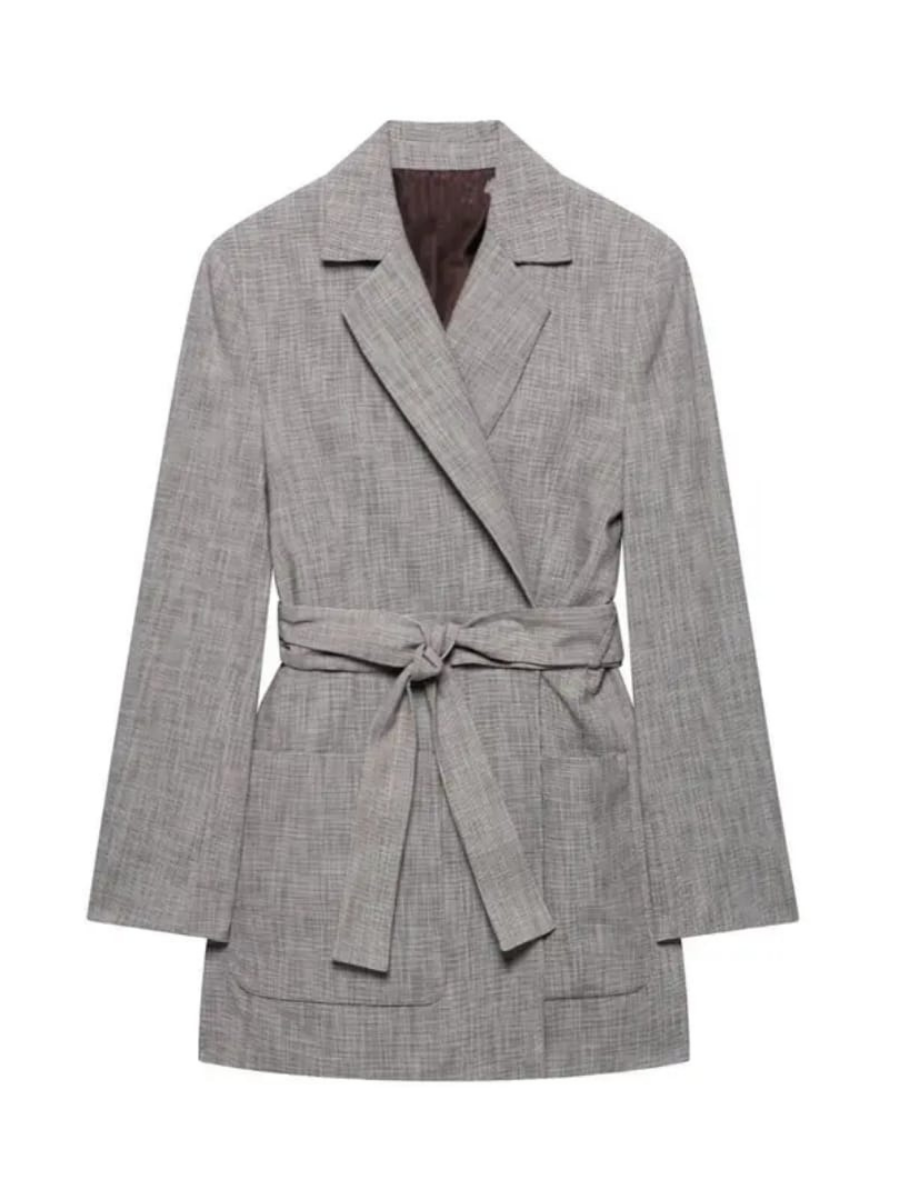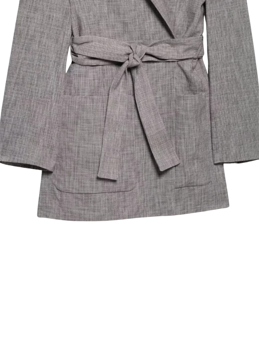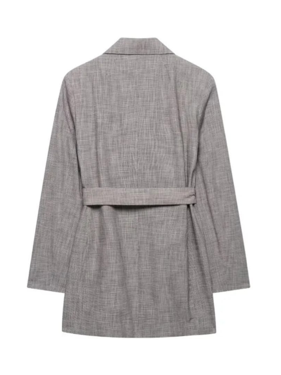 A structured blazer designed with a relaxed fit and a tie-up belt to define the waist. The clean lapel and longer length give it a sharp, tailored finish while keeping it easy to style.