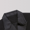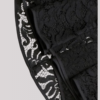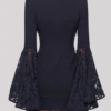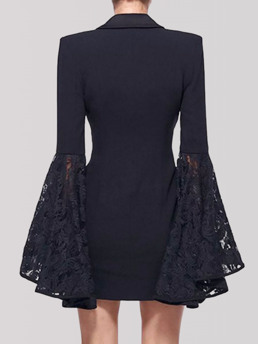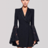 This double-breasted blazer dress features a sharp lapel, structured fit with a deep neckline and intricate lace sleeves that flare at the cuffs.